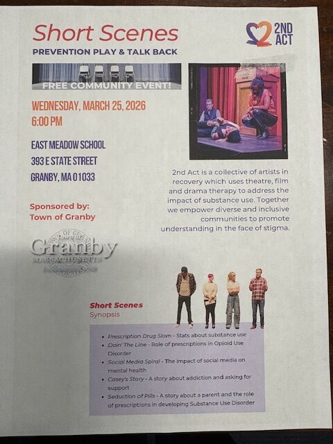 The Town of Granby is hosting a play “Short Scenes” on Wednesday March 25th at 6pm. This will be at the East Meadow School 393 East State Street, Granby. This is being funded by money the Town received as part of the Opioid Settlement with cities and towns.