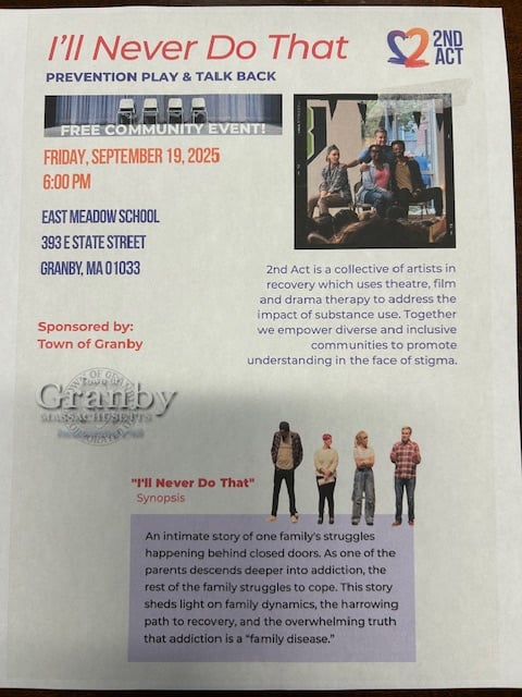 The Town of Granby is hosting a play “I’ll Never Do That” on Friday September 19th at 6pm. This will be at the East Meadow School 393 East State Street, Granby. This is being funded by money the Town received from the Opioid Settlement. All are welcome, you don’t need to be a resident of Granby.